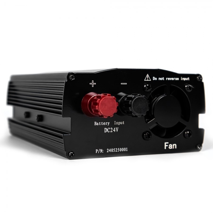 De omvormer is ontworpen voor veilig gebruik via een 24V-accu en biedt stabiele spanning, zelfs bij hogere belastingen. Sluit geen gelijkrichters, zonnepaneelregelaars of PV-systemen aan op de ingang. Zorg voor voldoende ventilatie tijdens gebruik om oververhitting te voorkomen en houd rekening met het continue vermogen bij het kiezen van aangesloten apparaten.