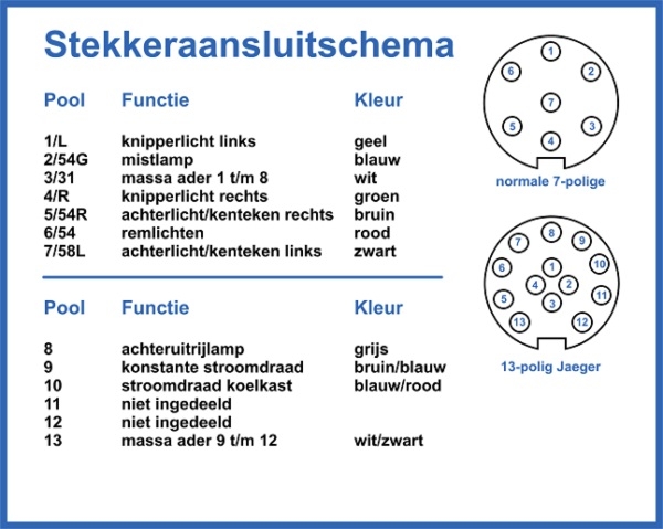 De 6 extra aansluitingen t.o.v. de 7-polige zijn bestemd voor 12 volt voeding, achteruitrijlichten, extra massa en een vrije positie.