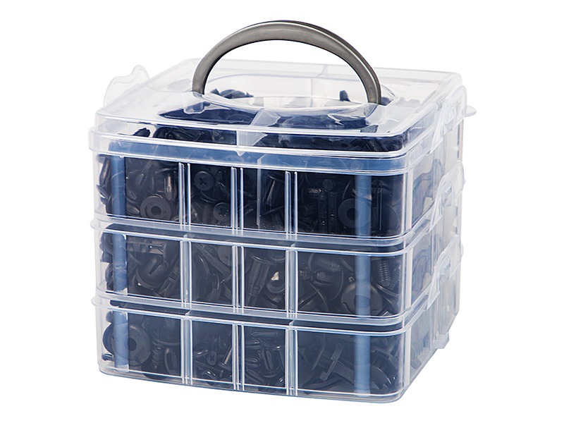 In deze grote assortiment doos vindt u 625 clips waarmee u autobekleding en automatten kunt vastzetten. Deze clips worden in 16 maten geleverd, samen met een handige tang om de clips weer los te trekken. Zo heeft u altijd de benodigde maat voorhanden. De clips zijn op maat geordend in compartimenten, zodat u ze snel en eenvoudig terug kunt vinden.
