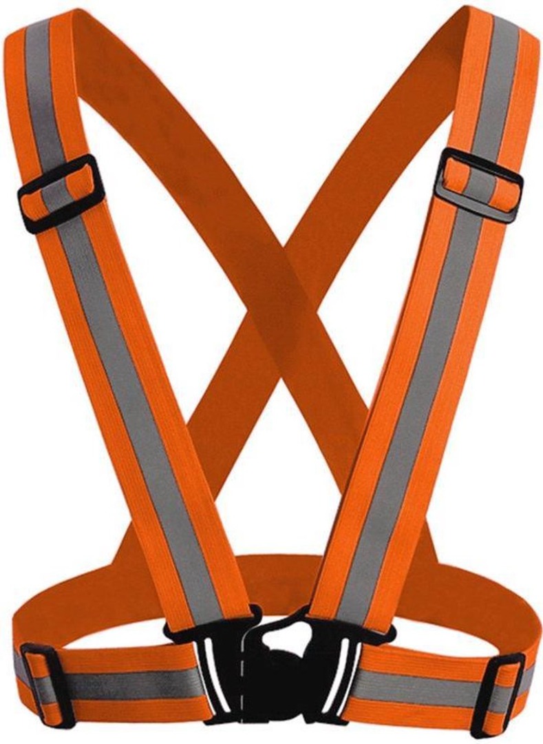 Dit verstelbare reflecterende harnas in opvallend oranje is ideaal voor veilig gebruik tijdens werk, sport of recreatie. De sterke reflecterende strepen zorgen ervoor dat u ook bij weinig licht goed zichtbaar bent. Dankzij het lichte gewicht en de elastische banden is het harnas comfortabel te dragen en geschikt voor vrijwel iedereen.