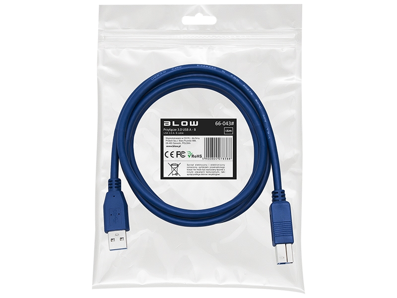 Deze kabel is voorzien van een USB-A en USB-B aansluiting. Deze aansluitingen zijn allebij in versie 3.0 geproduceerd, waardoor gegevensoverdracht vele malen sneller is dan USB 2.0. USB-B aansluitingen aansluitingen worden vooral gebruikt bij printers. De kabel is 1,5 meter lang en is blauw.