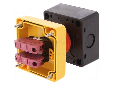 De schakelaar is een paddenstoel drukknop met een roterende reset functie.