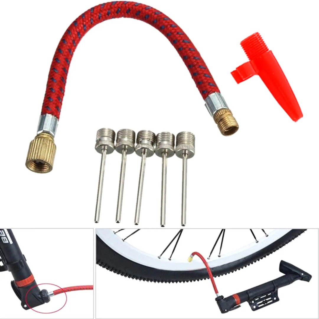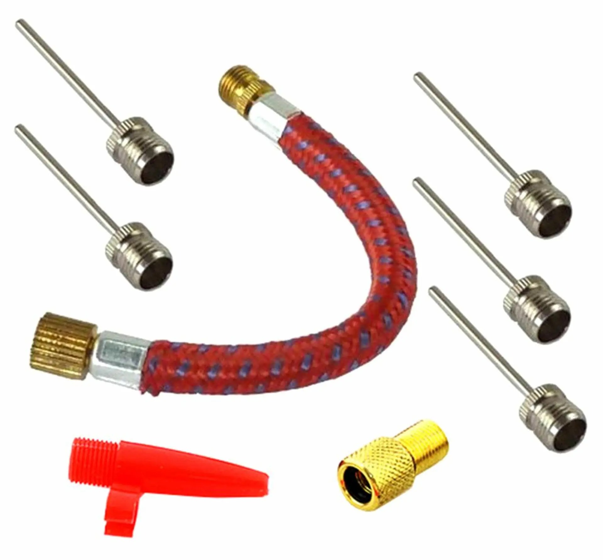 Met deze set kunt u allerlei soorten producten opblazen. Denk hierbij aan verschillende soorten ballen (geschikt voor voetbal, volleybal, tennis, basketbal, etc.), maar ook andere artikelen zoals luchtbedden, zwembaden, fietsbanden, etc. De set bestaat uit 8 onderdelen, waarvan 5 nippels, 1 luchtslang, 1 kunststof punt voor bijvoorbeeld luchtbedden, en 1 verloopstukje. Zo heeft u altijd het juiste verloopstukje om op te pompen wat u wilt.