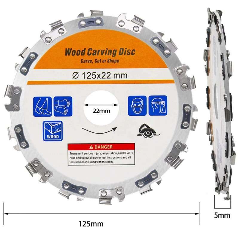Met deze kettingschijf kunt u uw hout weer bewerken en snijden. De kettingschijf is geschikt voor haakse slijpmachines, en heeft een diamter van 125mm. De ketting is voorzien 14 tanden, wat zorgt voor een egaal en glad resultaat. Verder heeft de kettingschijf een asgat van 22,2mm, ofwel 7/8". De maximumsnelheid van de kettingschijf ligt tussen de 10.000 en 13.000 rpm.
