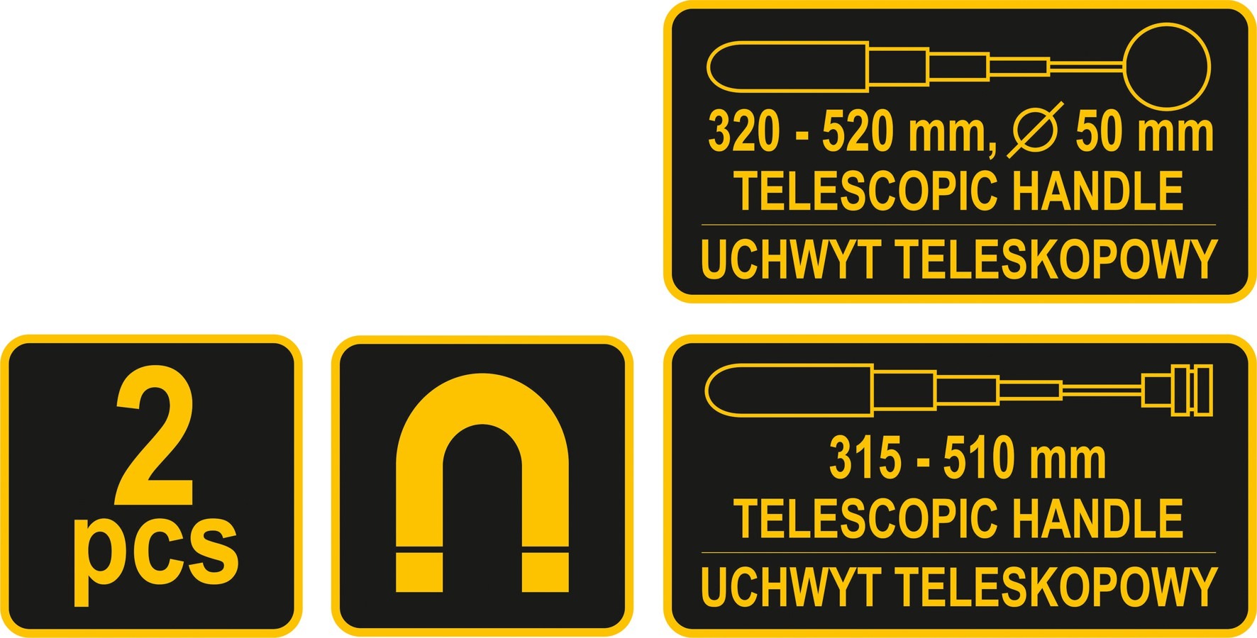 Deze twee tools zijn ideaal voor precisiewerk, of als uw ergens werkt met weinig ruimte. De pick-up is magnetisch aan het uiteinde en kan van 315mm tot 510mm worden uitgeschoven. Hierdoor kunt u bijvoorbeeld magnetische objecten oppakken waar u normaal gesproken niet bij zou kunnen met uw handen. De inspectiespiegel kan ook uitgeschoven worden, van 320 tot 520mm. De spiegel heeft een diameter van 50mm.