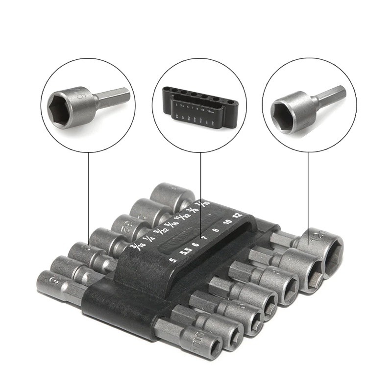 • 3/16, 1/4, 9/32, 5/16, 11/32, 3/8, 7/16, 5, 5.5, 6, 7, 8, 10 en 12