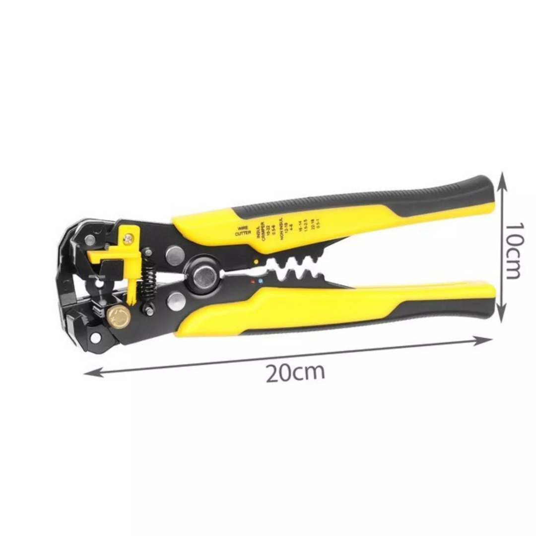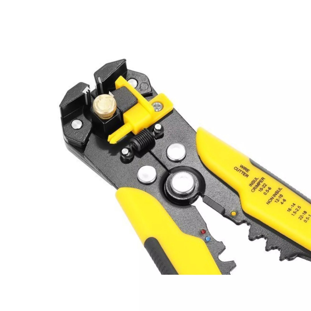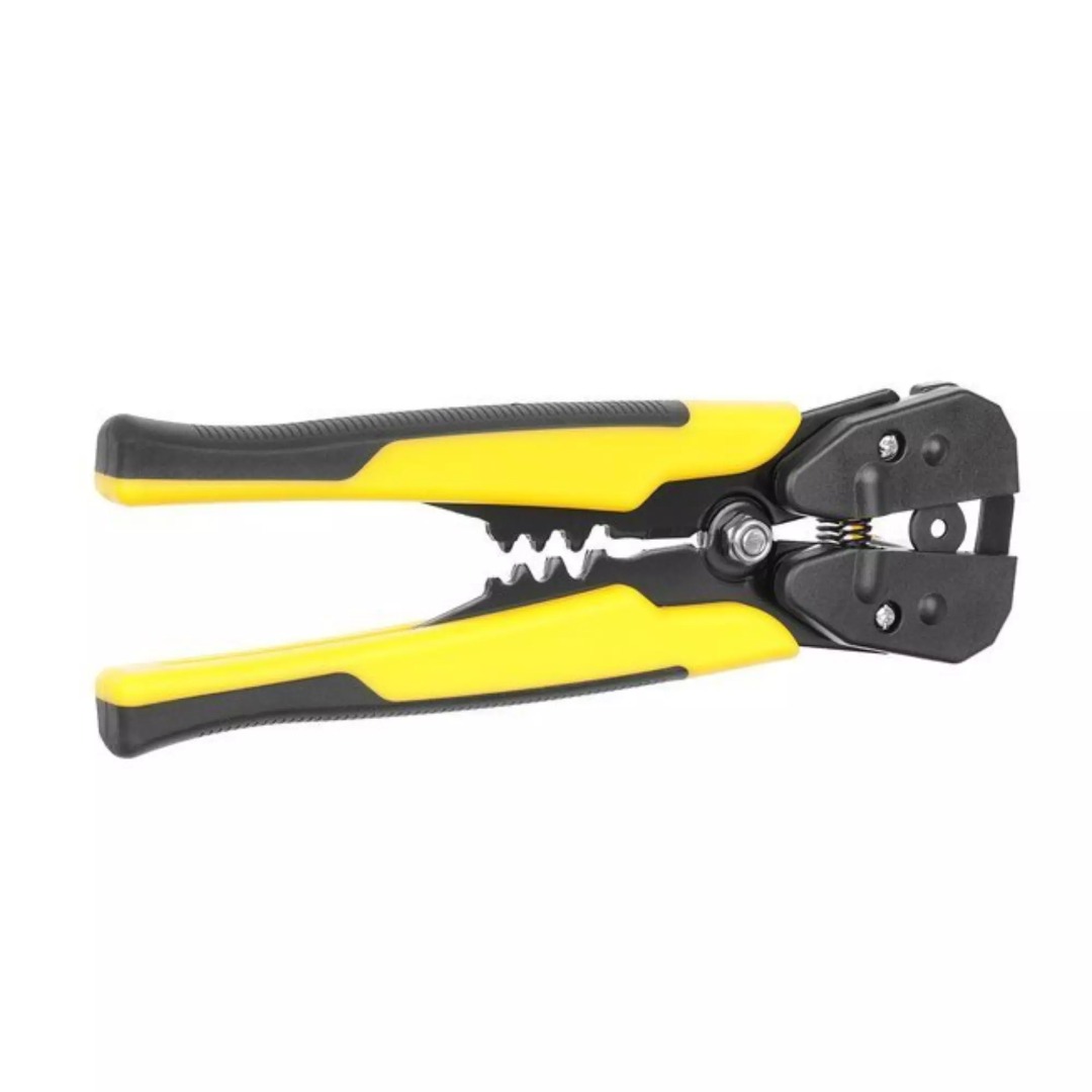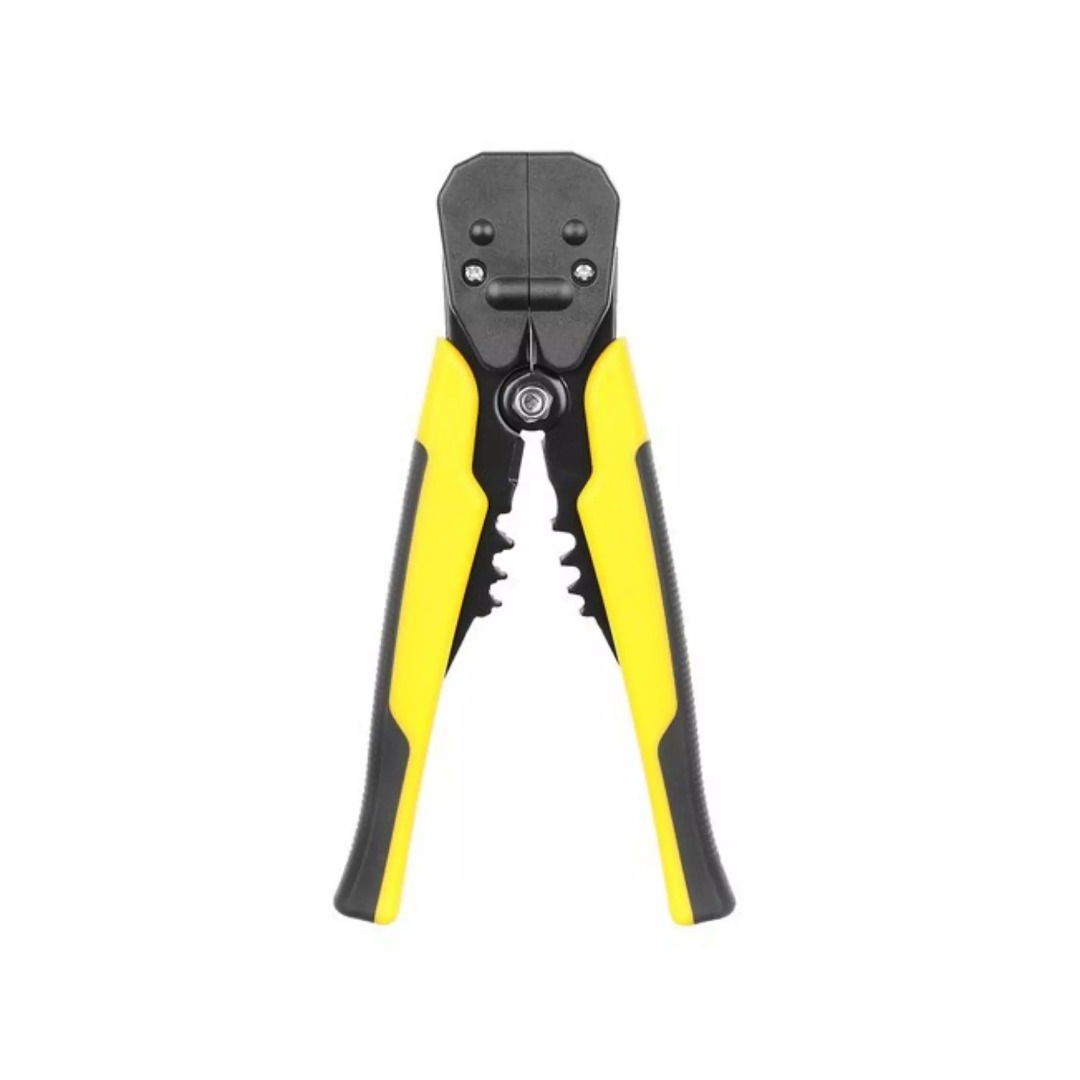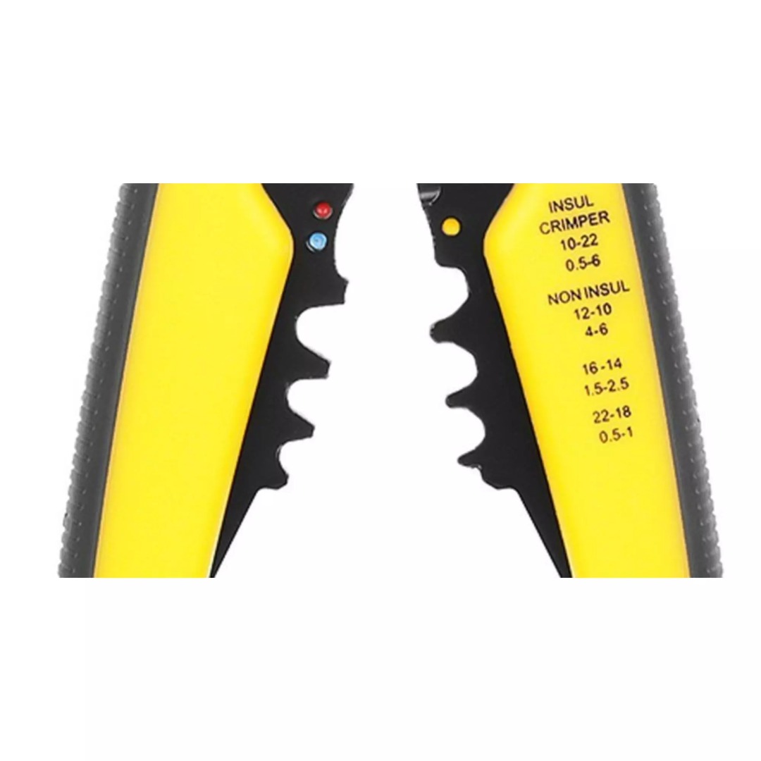 Deze goed uitgeruste krimptang is perfect voor het knippen en strippen van kabels. De tang maakt knip- en stripwerk mogelijk in kabels met een diameter van 24 tot 10 AWG, en kan zowel geïsoleerde als niet-geïsoleerde kabels krimpen met een diameter van 22 tot 10 AWG. De tang is gemaakt van hoogwaardig kunststof, en het knipgedeelte is gemaakt van met warmte behandeld staal. Verder heeft de tang vijf functies: een instelknop voor de kracht waarmee geknipt wordt, een instelbare lengte begrenzer, strippen, klemmen en afsteken.
