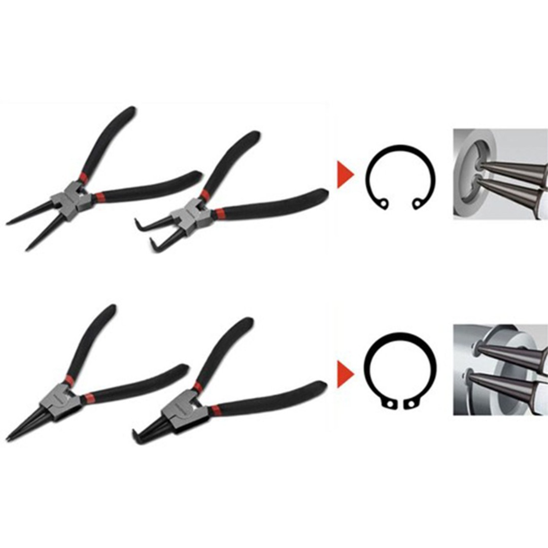 Met deze set kunt u gemakkelijk seegerringen lostrekken of verbuigen. De tangen zijn zowel geschikt voor interne, als externe seegerringen, en voor beide soorten worden twee tangen geleverd. Er worden twee rechte tangen (1 voor interne ringen, 1 voor externe ringen), en twee gebogen tangen (1 voor interne ringen, 1 voor externe ringen) in deze set geleverd. Zo beschikt u altijd over een tang die werkt. Verder zijn de tangetjes gemaakt van gereedschapsstaal en voorzien van een handige springveer, waarmee u eenvoudig kracht zet en met meer comfort werkt. Daarnaast zorgt de veer ervoor dat de tang altijd terugveert.