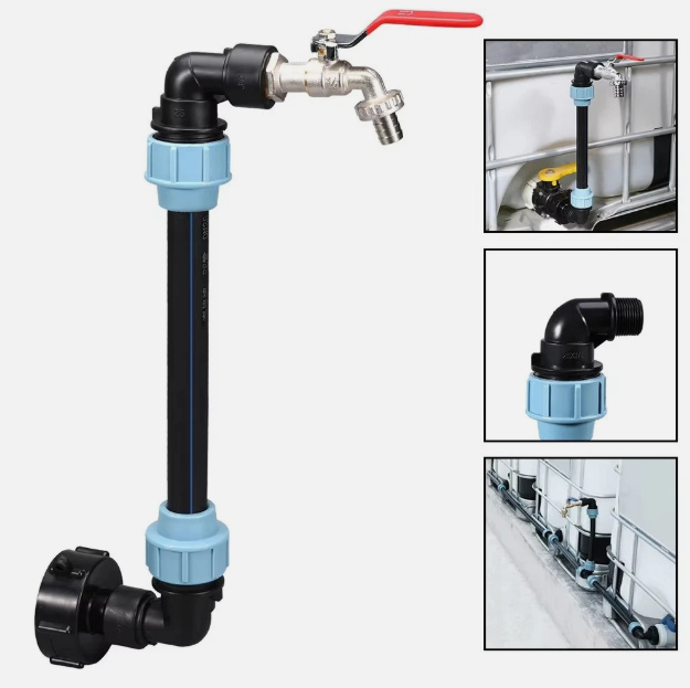 De standaard S60x6 IBC-schroefdraad maakt de kraan compatibel met de meeste 1000L IBC-containers. Het ontwerp met snelkoppeling en 40 cm slangstuk zorgt voor veelzijdig gebruik en eenvoudige aansluiting.
