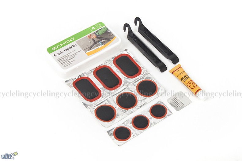 Tijdens een fietstocht een lekke band repareren met de bandenplakset en pomp.