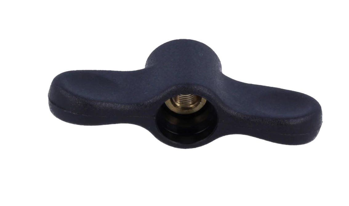 Deze draaiknop met vleugels bevestigt u eenvoudig aan draadeind. Door de vleugels draait u de knop eenvoudig vast. Daarnaast is het kunststof waarmee de knop is gemaakt bestendig tegen de meeste oliën. Verder is de naaf gemaakt van roestvrij staal, wat de levensduur van deze knop aanzienlijk verhoogt. De knop heeft een schroefdraad in de maat M6, met een lengte van 12mm. De knop is 47mm breed en 24mm hoog.