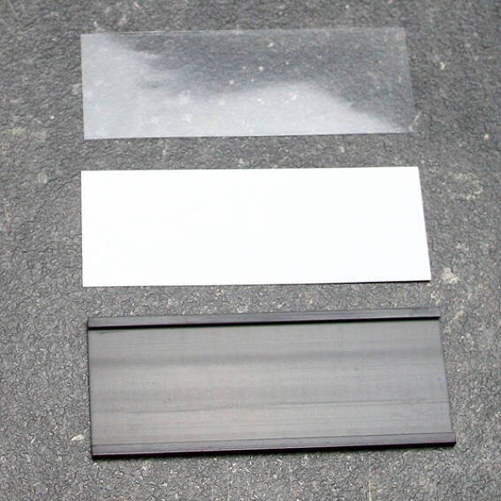 Het etiket wordt afgedekt en beschermt met een transparante kunststof plaatje.