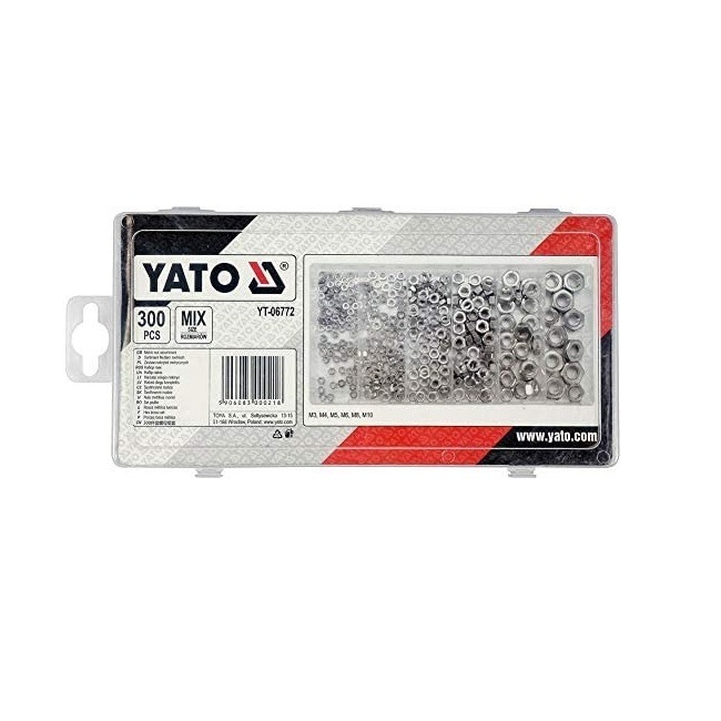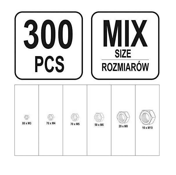 Deze assortiment doos bevat een set met maar liefst 300 hoogwaardige moeren. Alle moeren zijn metrisch, wat inhoudt dat de moeren op elke soort bout van dezelfde maat passen. De set bevat de volgende maten: M3, M4, M5, M6, M8 en M10. De doos heeft handige sorteervakjes waar alle moertjes op maat in zijn gelegd, zodat de assortiment doos overzichtelijk en netjes blijft.