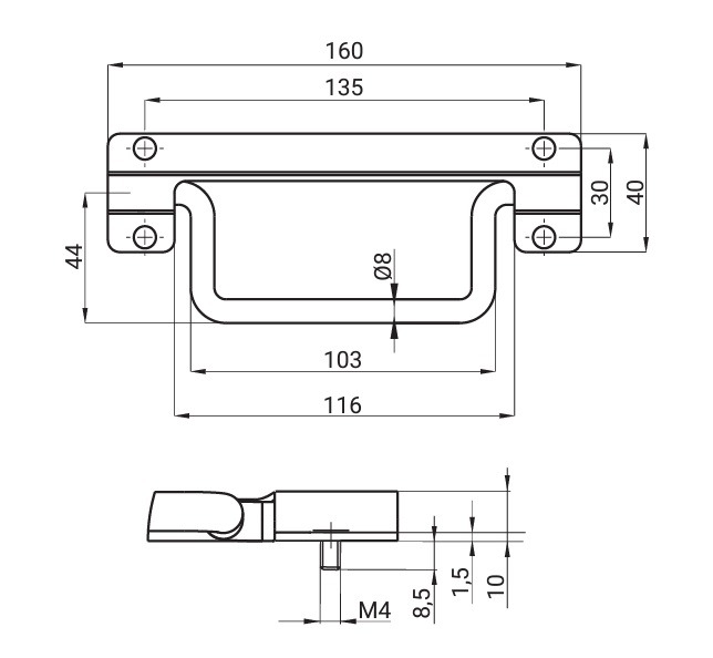 Het handvat is voorzien van 4 geklonken m4 boutjes 8mm lang. Hierdoor is het handvat eenvoudig te monteren.