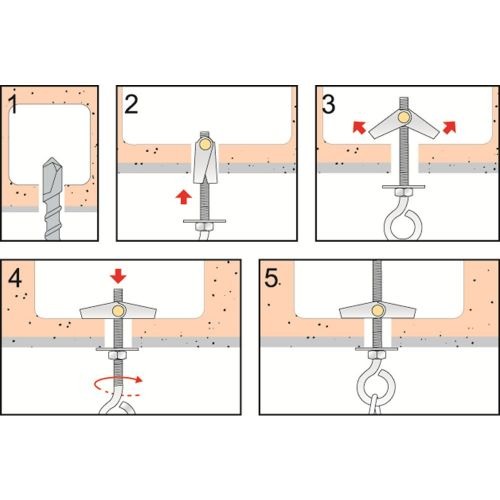 Met deze "paraplu" plug bevestigt u eenvoudig een ijzeren oog in bijvoorbeeld een pijp, holle wand, of een hol plafond. De plug heeft een ingebouwde veer, waardoor de plug als het ware inklapt wanneer deze door een opening wordt geduwd. Als de plug door de opening heen is, ontvouwt deze zich, en zorgt de plug ervoor dat het oog goed op zijn plek blijft zitten en op die manier stevig bevestigd kan worden. Het oog heeft M6 schroefdraad, en in totaal een lengte van 100mm. De plug en het oog zijn beiden volledig gegalvaniseerd, wat voor een lange levensduur zorgt. Ook wordt de plug geleverd met een ring en moer, om zo de plug op de juiste wijze te kunnen bevestigen.