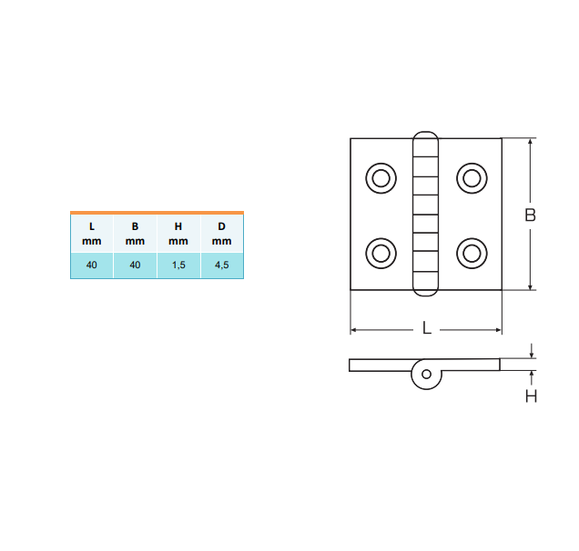 Dit scharnier kunt u voor een aantal verschillende toepassingen gebruiken. Het scharnier kan bijvoorbeeld gebruikt worden voor de montage van een deur, of zware deksel. Het scharnier is gemaakt van een roestvrij staal, en heeft een breedte van 40mm en een hoogte van 40mm. Verder is het scharnier voorzien van vier montagegaten met elk een diameter van 5mm.