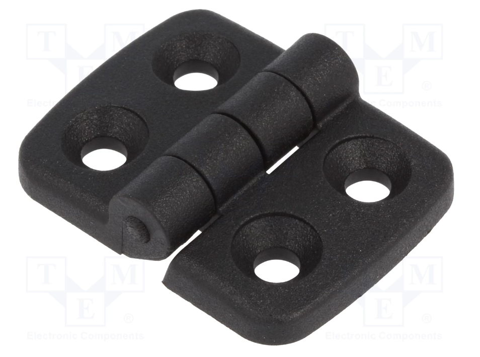 Dit zwarte scharnier kunt u voor een aantal verschillende toepassingen gebruiken. Het scharnier kan bijvoorbeeld gebruikt worden voor de montage van een deur, of deksel. Het scharnier is gemaakt van kunststof, en heeft een breedte van 20mm en een hoogte van 20mm. Verder is het scharnier voorzien van vier montagegaten met elk een diameter van 4.5mm.