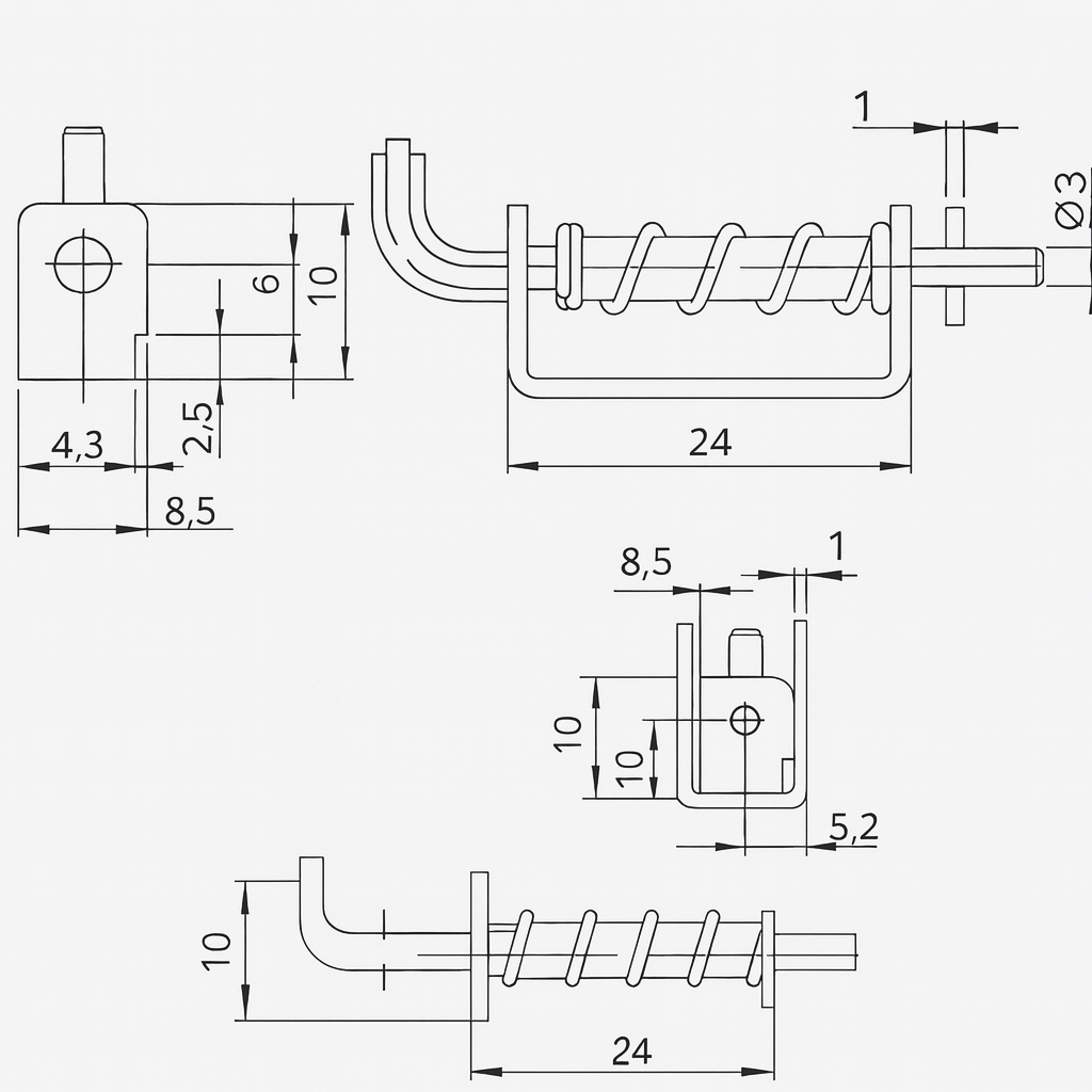 Het scharnier is vervaardigd uit hoogwaardig staal voor optimale sterkte en duurzaamheid. De geïntegreerde spiraalveer biedt een stabiele en soepele werking. De compacte bouw (10 × 8,5 × 24 mm) maakt het geschikt voor beperkte inbouwruimtes en technische toepassingen waarbij precisie en betrouwbaarheid belangrijk zijn.