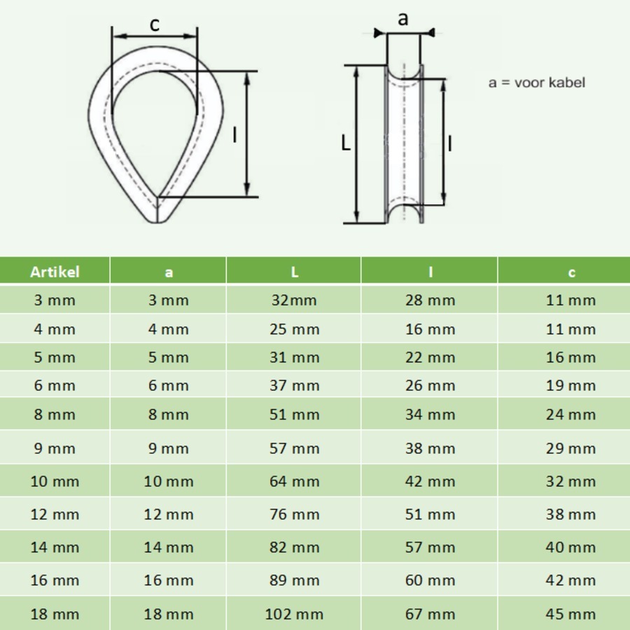 Productomschrijving Deze stalen puntkous met een diameter van 6 mm is ontworpen om touwen en kabels te beschermen tegen slijtage en knikken bij gebruik met harpsluitingen, haken of klemmen. De verzinkte afwerking biedt uitstekende bescherming tegen roest en corrosie, terwijl het gebruikte zuurbestendige staal extra bestand is tegen invloeden van vocht, zout en chemische omgevingen. Hierdoor is de puntkous geschikt voor zowel binnen- als buitengebruik, zelfs in maritieme en industriële omstandigheden. Ideaal voor scheepvaart, bouw en andere toepassingen waar duurzaamheid en veiligheid belangrijk zijn.