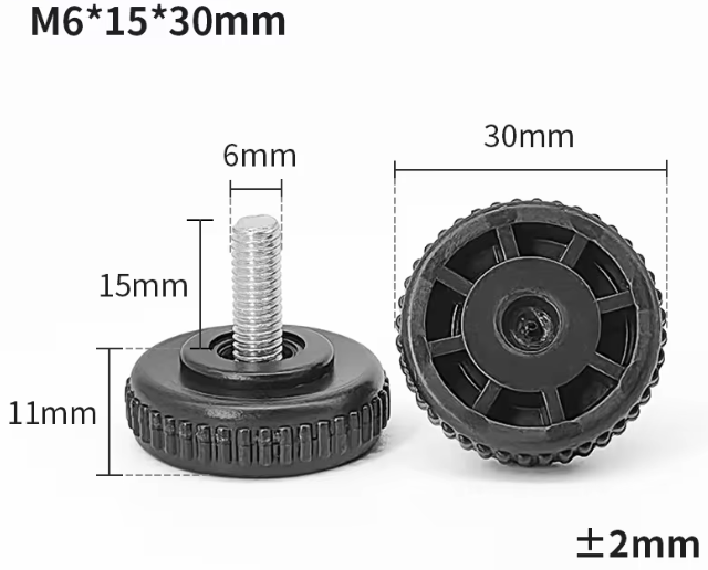 De poot is voorzien van een M6 schroefdraad met een lengte van 15 mm en een voetdiameter van 30 mm. De kunststof voet van 11 mm dik zorgt voor extra grip en voorkomt krassen op vloeren. Ideaal voor gebruik onder metalen frames, kasten, stoelen of werkbanken.
