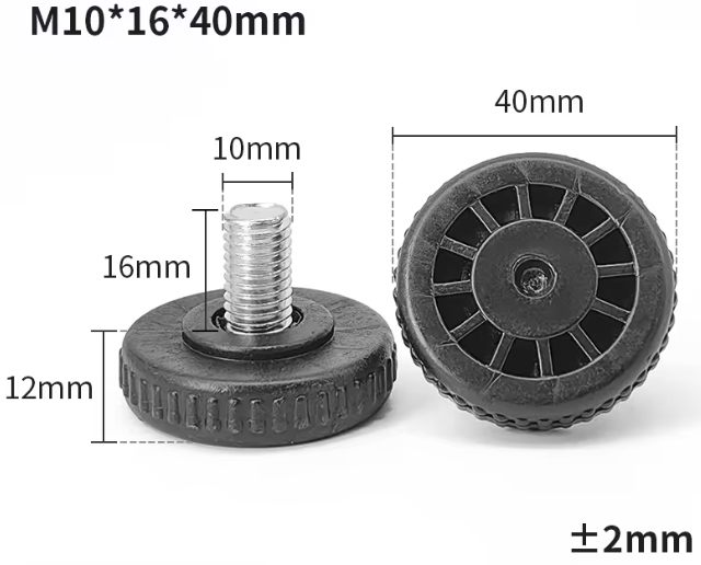 De poot is voorzien van een M10 schroefdraad met een lengte van 16 mm en een voetdiameter van 40 mm. De kunststof voet van 12 mm dik zorgt voor extra grip en voorkomt krassen op vloeren. Ideaal voor gebruik onder metalen frames, kasten, stoelen of werkbanken.