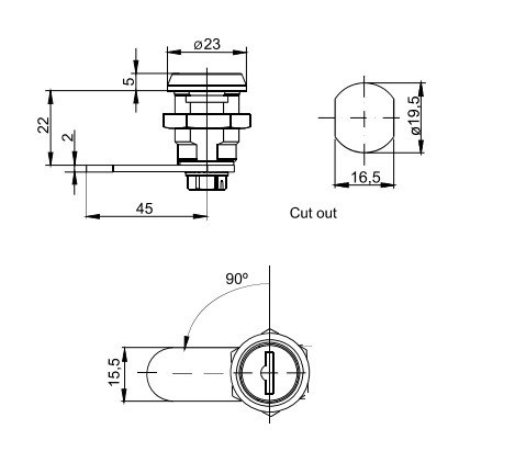 Kantel slot ook wel brievenbus slot genoemd met een gatmaat van 23mm.Veel gebruikt bij lockers, brievenbussen en opbergkasten.Verder heeft het slot een rotatie van 90 graden en heeft het 2 vaste posities, waarvan op 1 positie de sleutel eruit kan. Dit slot is voorzien van een M22 moer voor een stevige montage.Inclusief extra tweede sleutel