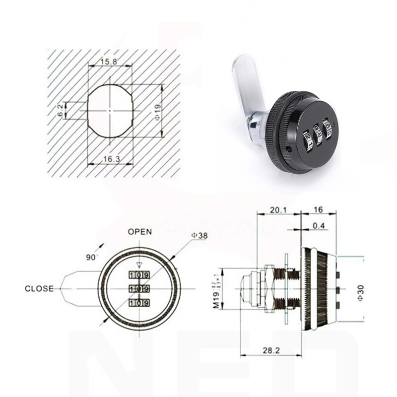 De driecijferige code is in te stellen en te wijzigen. Het slot kantelt 90 graden. Pas bij geslote toestand kan de code weer verdraaid worden om het slot te sluiten. De code wijzigen kan alleen in wanneer men de juiste code weet. Het slot kan gewoon gemonteerd blijven om de code te wijzigen. Het slot is geschikt voor een gat diameter van 19mm en een inbouwdiepte van 20mm. Voor verdere maten van de lepen en inbouwdiepte verwijzen wij u naar de technische tekening,