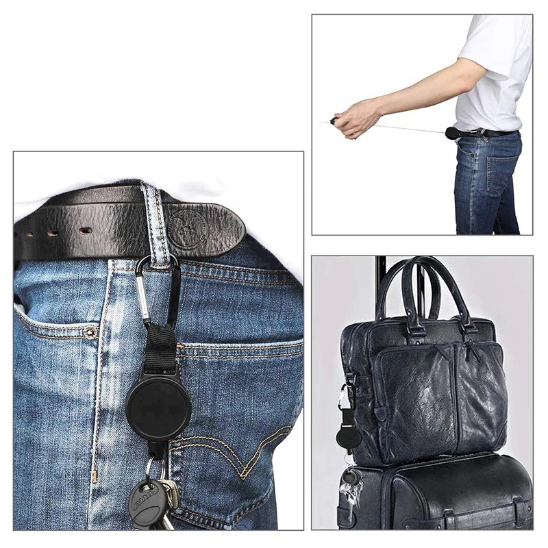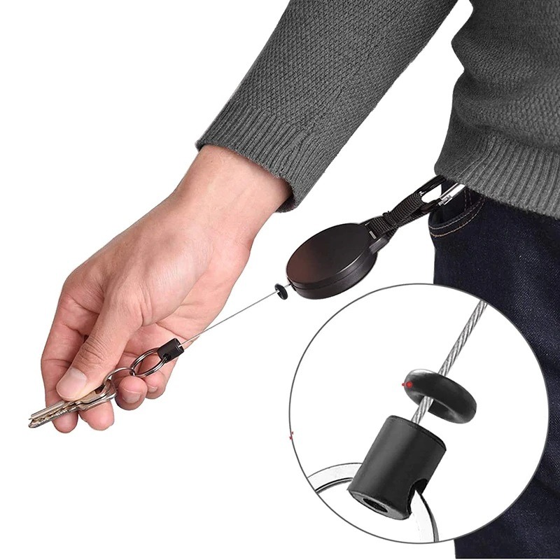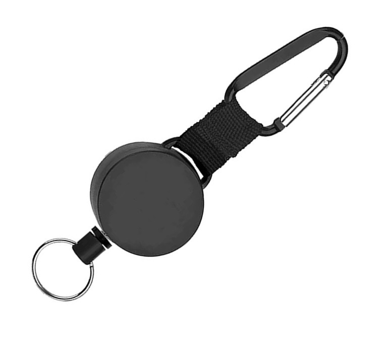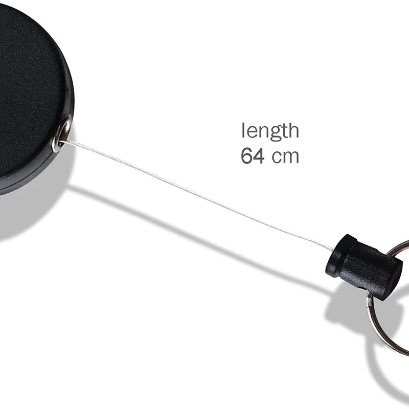 De perfecte oplossing voor een sleutel of pas die altijd binnen handbereik moet zijn. Je hangt de karabijn eenvoudig aan uw broek of tas. Bij gebruik trekt u het koord tot wel 64cm uit. Na gebruik laat u het koord los en rolt deze vanzelf weer op. De ring en de veer maakt het geheel geschikt voor zware voorwerpen. Het kastje zelf is van hard kunststof en het koord van dun metaal.