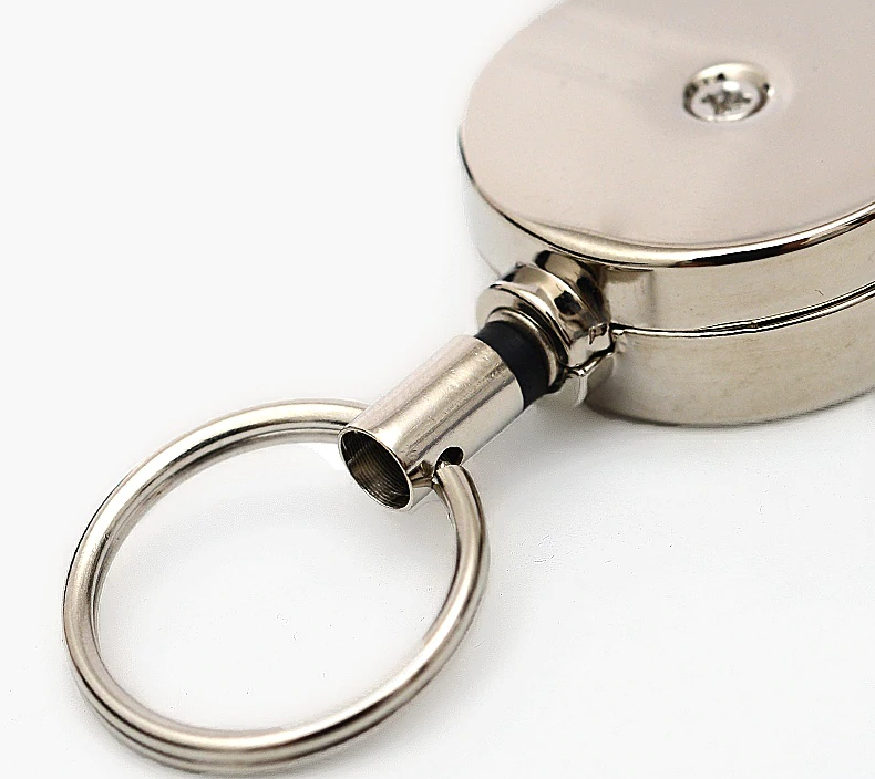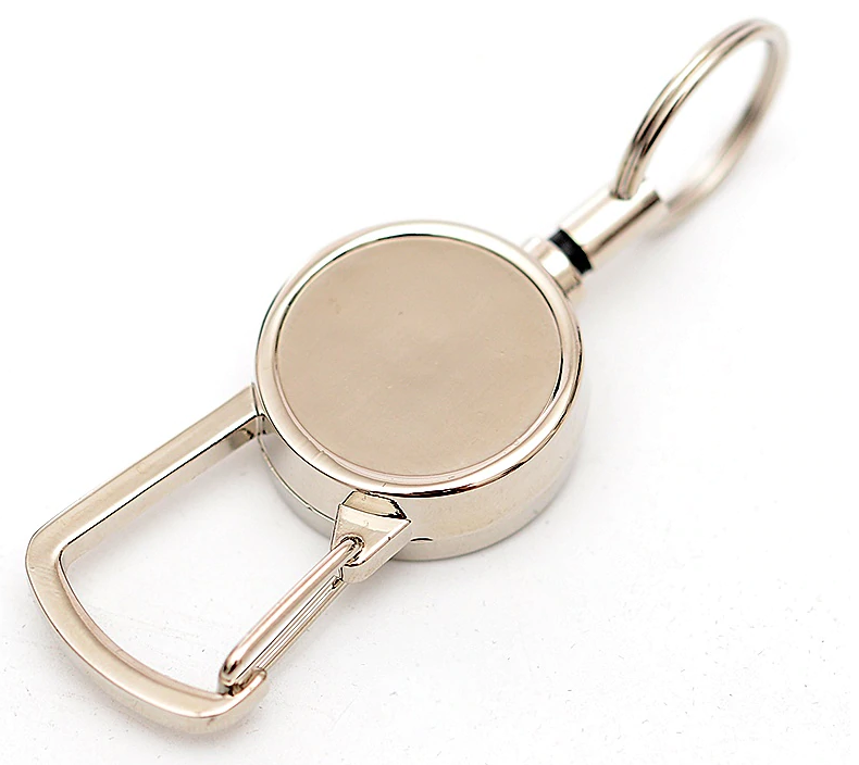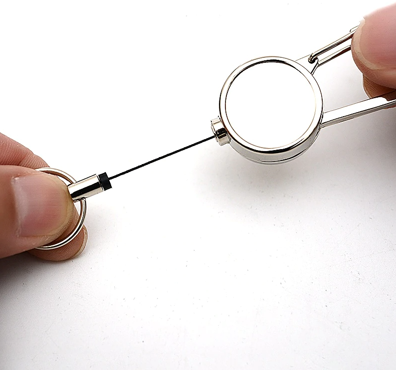 Je hangt de karabijn eenvoudig aan uw broek of tas. Bij gebruik trekt u het koord tot wel 64cm uit. Na gebruik laat u het koord los en rolt deze vanzelf weer op. De ring en de veer maakt het geheel geschikt voor zware voorwerpen. Het kastje zelf is van hard metalen het koord van dun nylon.
