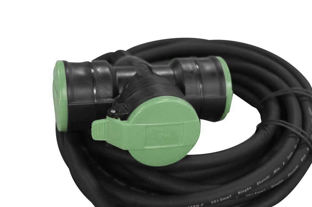 De stekkerdoos welke 3 230V aansluitingen heeft een beschermingsklasse van IP44 en hierdoor ideaal voor buitengebruik.