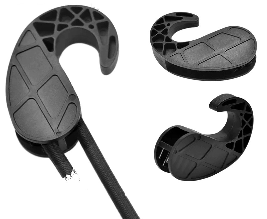 Met deze 'doe het zelf' haken maak je in één handomdraai een snelbinder op maat. Deze haken zijn toepasbaar op 5 tot 10mm rond elastiek. Door het gebruik van weerhaken en een v-groef zet het elastiek zichzelf maximaal vast in de haak. Maar indien gewenst kan je de haak ook weer in een handomdraai los halen. Dus veranderd uw vracht of heeft u ieder moment van de dag andere lengte snelbinder nodig, dan is dit de oplossing. De haak is gemaakt van zeer stevig kunstof en voorkomt daardoor beschadigingen bij het bevestigen.